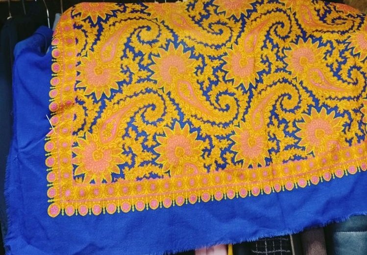 Показываю мой платочек ппх_23, такого колорита пока нет в коллекции. Надо сказать, что ранее указывали другой размер, а мой - маленький, 70 на 72 см.