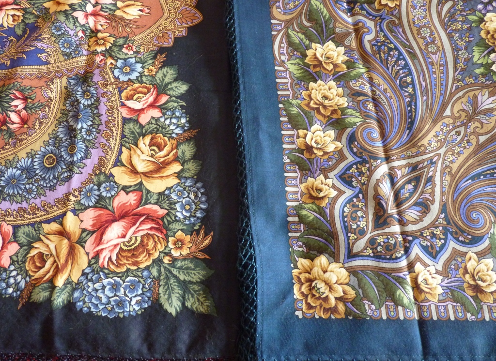 Сравнение колоритов шелкового платка Восточная сказка старого и нового разлива. Кайма нового бледнее, хотя сам рисунок чуть более ярче.