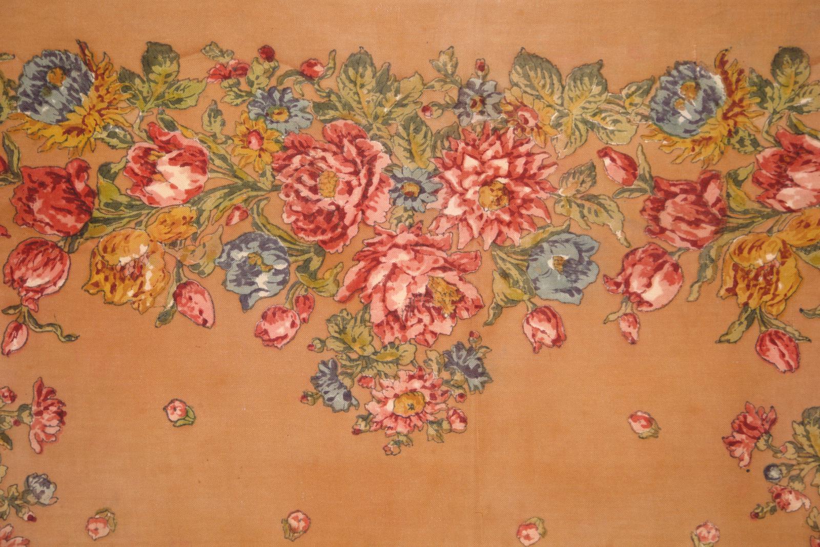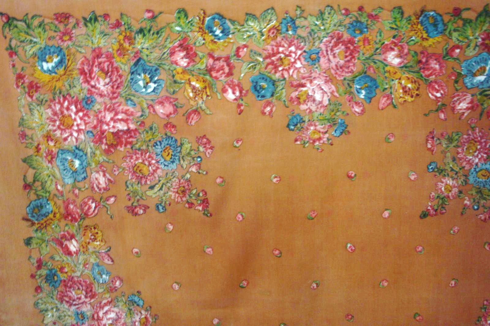 Время печати точно определять не возьмусь, так как попала шаль ко мне в руки в плачевном состоянии. Даже не так, вообще без состояния. Если бы не очевидность ручной набойки, я не стала бы ею заниматься. И ещё предположение, что шаль всё-таки довоенная...