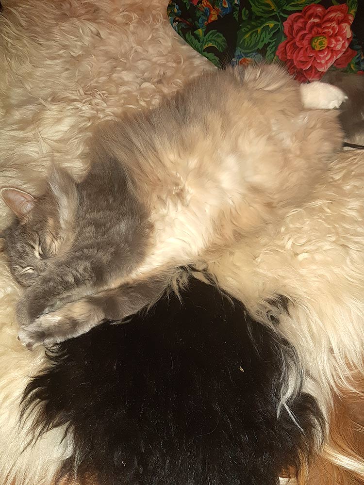 И в виде пуфика, тут главное на кошака не сесть, что мех, что кошак, поди разбери где что. Да, платок старинка Регуновой