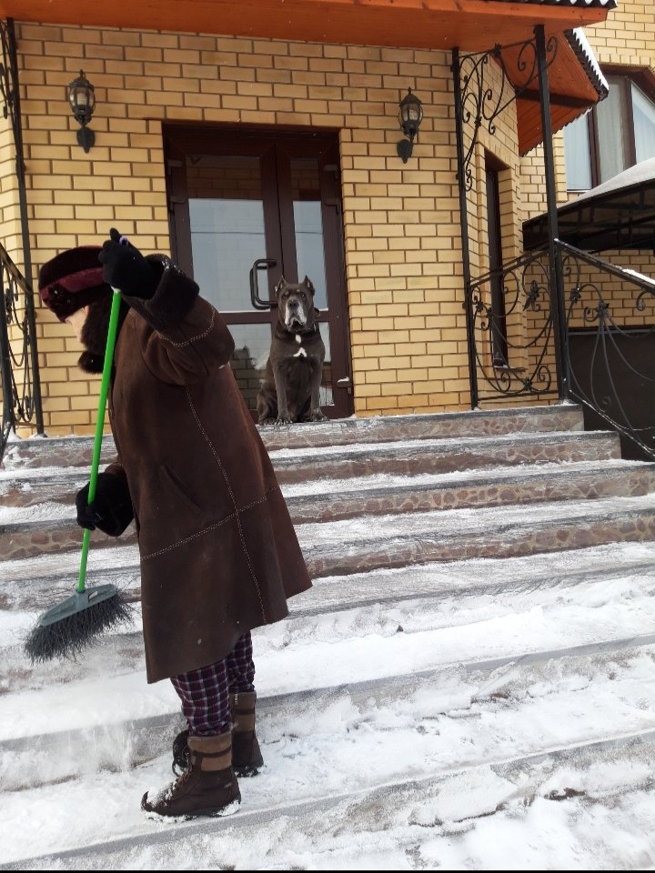 Мы сегодня снег убирали, Борз помогал и в дозоре стоял сидел. Уже 11 лет исполнилось ему, в декабре. Дома спит очень много, как и положено дедушке, слышать хуже стал.
