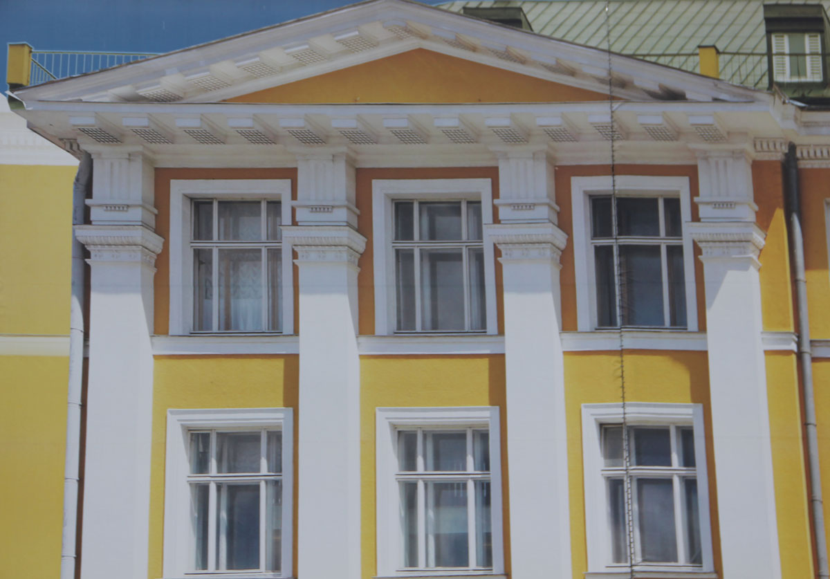Сфотографировала "фотообои" на административном здании... поверьте - это такая роспись с подробными отражениями в окнах, с тенями от солнца. А само здании на ремонте.