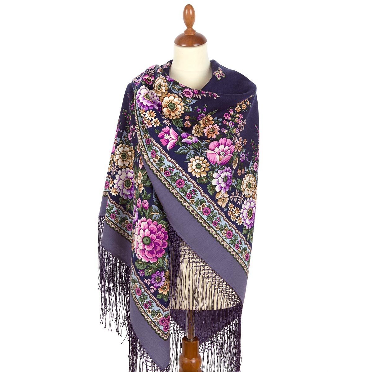 Многоцветный платок из уплотненной шерстяной ткани с шелковой бахромой, 148х148см, коллекционный