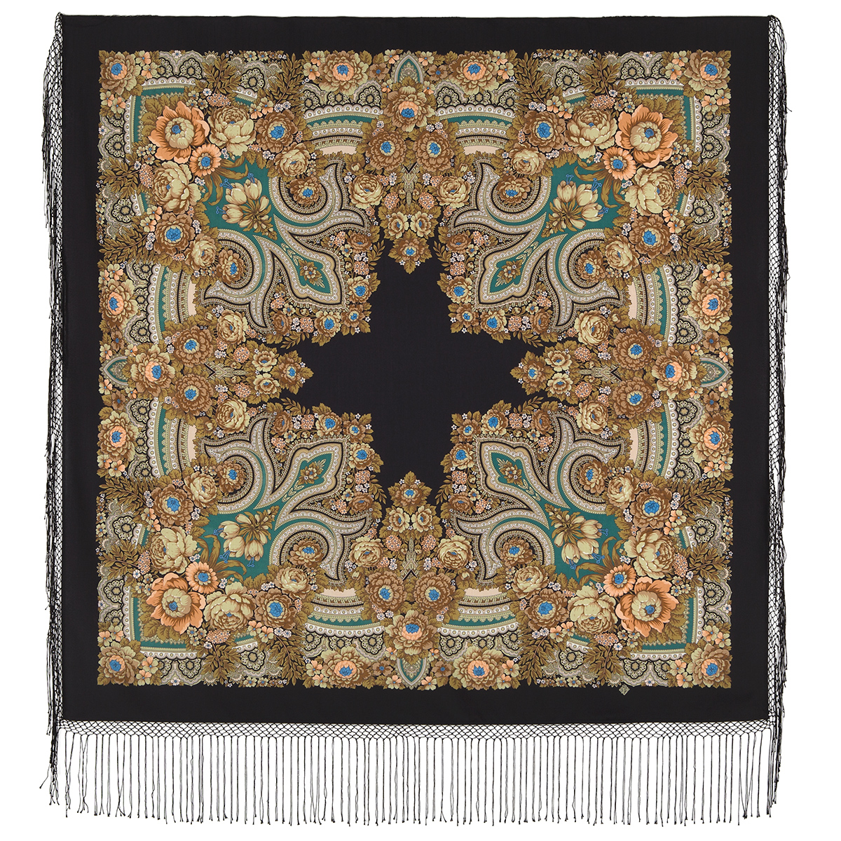 Платок из уплотненной шерстяной ткани с шелковой бахромой, 148х148см.