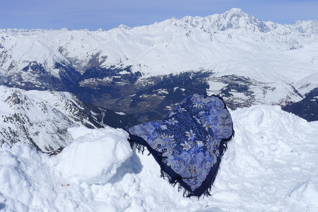 Как развиднелось, двинули на Aiguille Rouge (3226 м), откуда открывается захватывающая панорама четырехтысячников, включая высшую вершину Альп - Монблан, Гранд-Жорас и др. Народ вовсю фотографируется, восседая и возлегая на снежном бруствере. Морозко тоже вписался неплохо в эту славную компанию