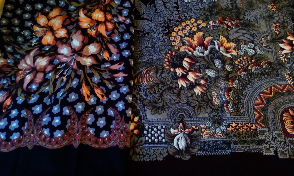Хоть это и не актуально, наверное, но с надеждой на перевыпуск этих платков, размещу тут сравнение ушедших платочков Амазонка-18 И.П.Дадоновой и Бархатный-7(или 17) Т.Сухаревской - кайма у них одинаковая в реале, а на фото показывается разной всё-таки. И очень-очень хамелионистые цвета. На Амазонке лилии могут показаться вплоть до лимонно-жёлтых. А Бархатный мечется от холодного к тёплому... Всё зависит даже не столько от освещения или размещения источника света, а прямо вот даже от местоположения камеры - чуть угол съёмки меняется - и всё! - цвет платков другой уже!