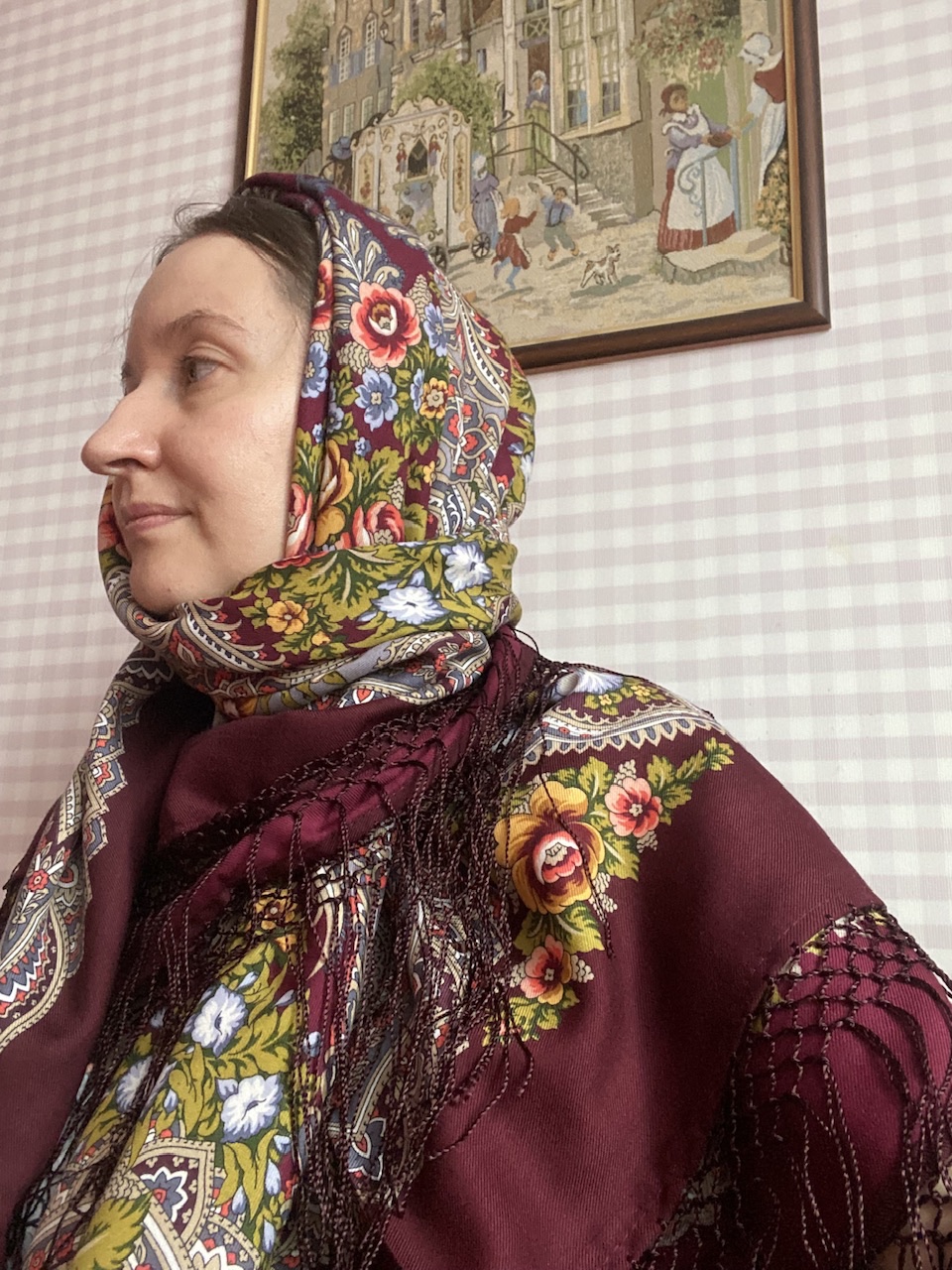 Я тут смогла живьем увидеть и даже примерить новый 5-ый колорит Лета в Павлове: мне понравился! Идет. Заливка фона роскошная винная, ну я так вижу там бордо с капелюшкой фиолета, по памяти напомнило немного любимый Нежный вечер-7, серый божественно темноват и густоват. Даже листья не такие агрессивно-зеленые: на фото они намного ярче, а в жизни достаточно доброжелательны ко мне.