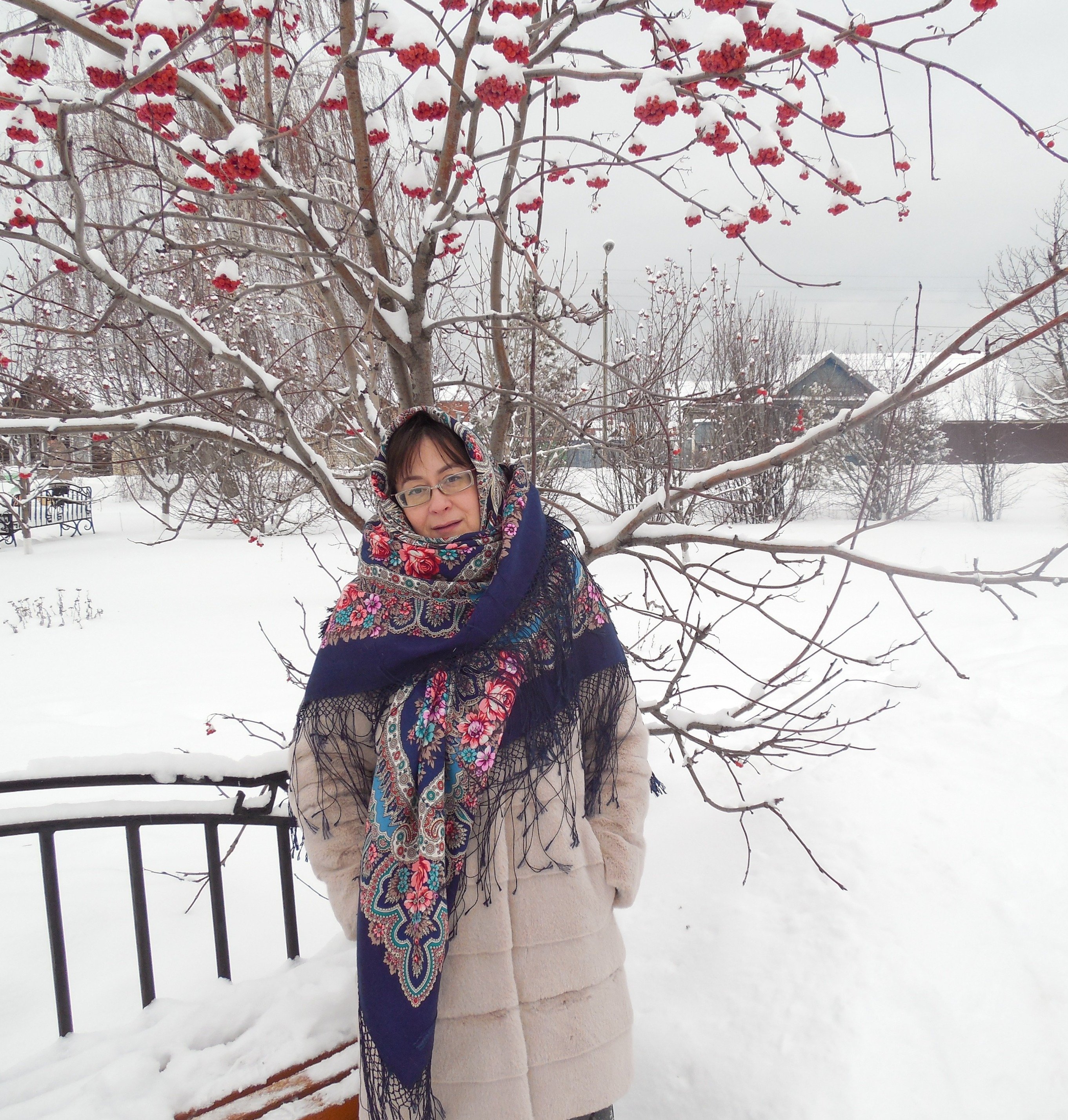 Девочки, сейчас будет Подвиг! Я сама не помню, сколько лет не показывала свои фото на форуме :". Давно это было. Хотя я всегда здесь. Дня не проходит, чтобы не заглянула на любимые странички. Я тут заряжаюсь позитивом и энергией. Полюбовалась красотой наших дам, насладилась прекрасными платочками и можно жить дальше. Хожу, в основном, молча, за что прошу прощения у всех, кто дает нашему форуму жизнь! Я и так-то по природе молчалива, а сейчас еще и период жизненный какой-то уж совсем неразговорчивый. Но вчера, случайно, я взглянула на дату своей регистрации тут и - ого! - да у меня на носу десятилетие :shock:! С мужем поделилась. А он сегодня вытащил меня на улицу, сунул в руки шали на свой вкус и повез фотографироваться!!! Там холодно, ветер - под конец съемок замерзла как цуцик. Что-то получилось, что-то нет, но покажу все же, решусь. Первой покажу шаль, которую мне подарил сын. Он вернулся из армии в декабре и вот на почти все дембельские преподнес мне давнюю мою мечту - Павловопосадский-16. Долго я шла к этой шали, все боялась, что не мое совсем. Но сын отмел все сомнения, решив все сам.