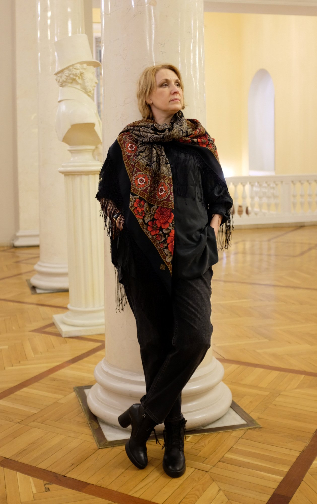 эту шаль нужно именно так носить, с этой одеждой и в этих стенах, и около этого рояля!