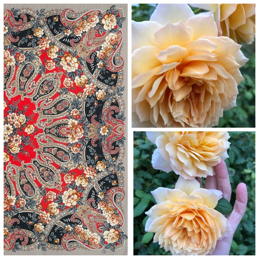 Вчера у знакомых на даче...сразу узнала с какого сорта роз ( сорт затрудняюсь назвать) срисованы цветки ( предположительно) на "Река любви" -2. Интересный платок и розы шикарные.
