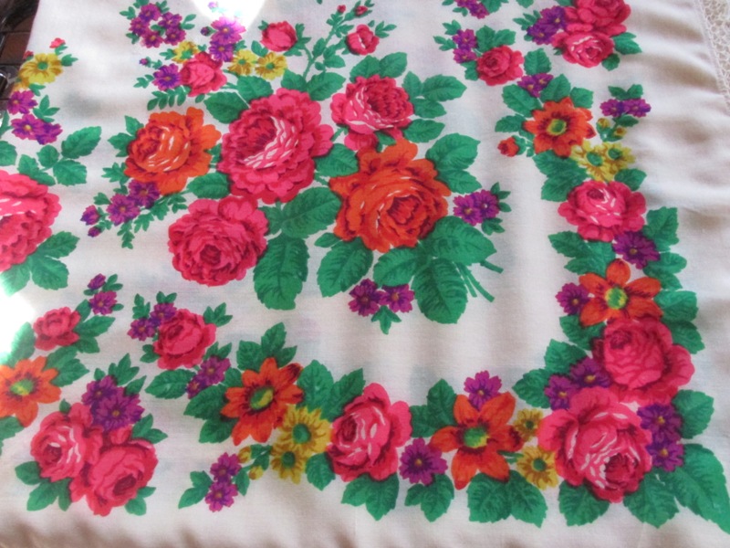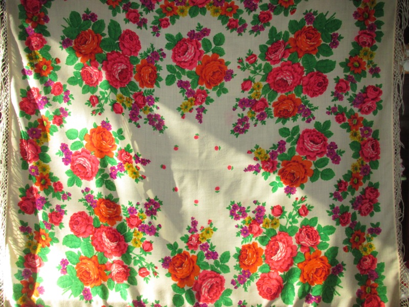 Надо сказать, что красная Цветочная сказка и бордовая - просто совсем разные платки. Ничего общего, кроме общего времени изготовления. Мне обе нравятся, но по-разному. Бордовая Цветочная Сказка в моем восприятии - бархат, на котором горят, как огоньки, живые, ароматные, огромные розы - жаркие!