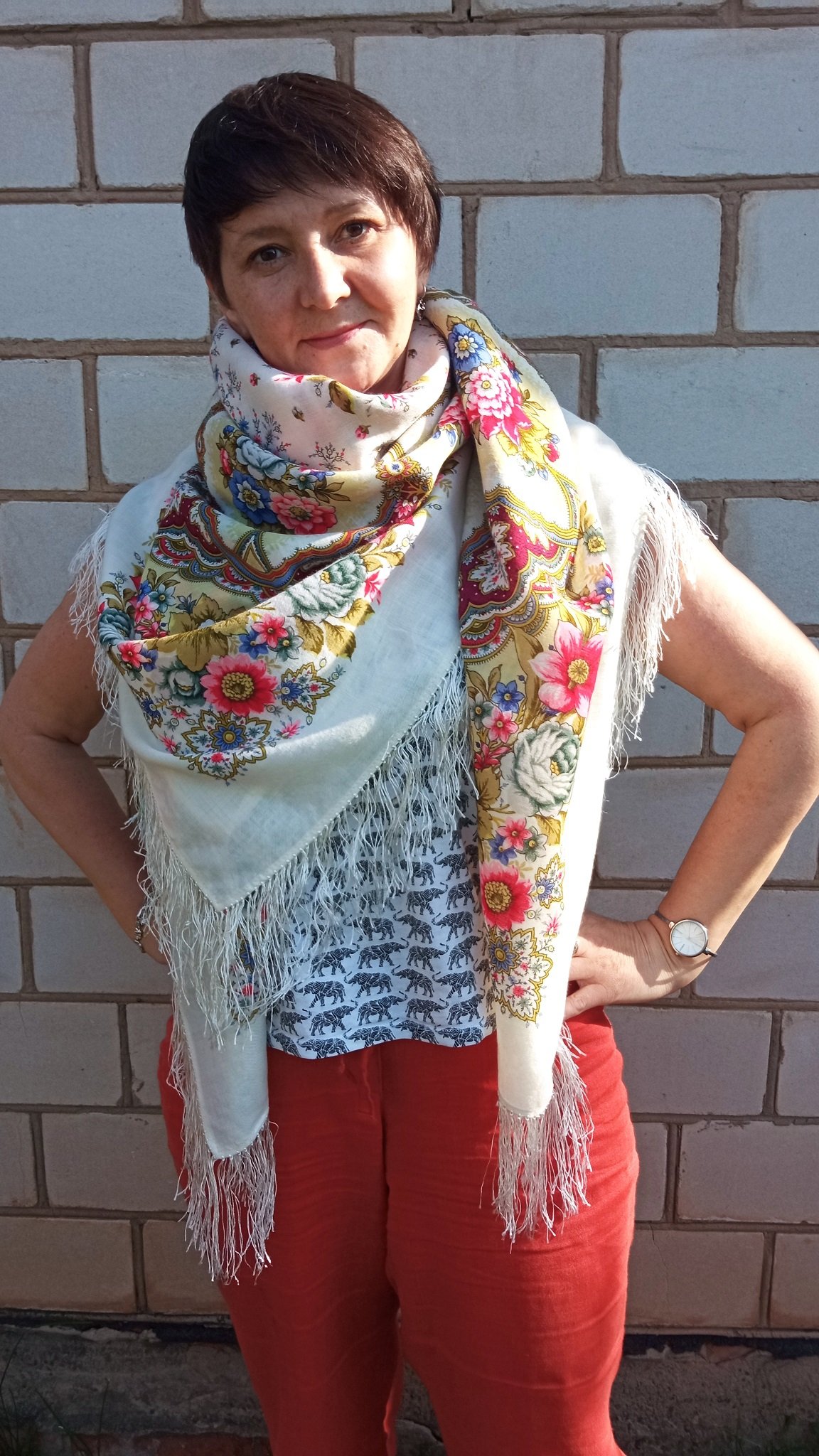 Лена, платок Вам очень идёт. Надо же, я -то думала, что он для кареглазых, а и светлоглазым блондинкам в нем ослепительно хорошо.