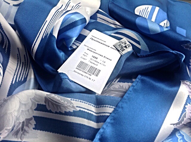 Но, мне нравится и мой платок ассиметричностью рисунка, красивым сочетанием синего, белого и разных оттенков серого цветов. С темно-синей юбкой в мелкий горошек длиной до середины икры и светлых балетках (здесь были бы уместны и кроссовки) данный платок в этом колорите придает какую-то определенную ретро-нотку, в том числе и за счёт своего рисунка. ИМХО, разумеется