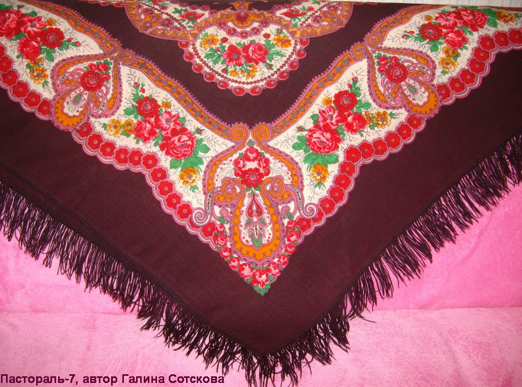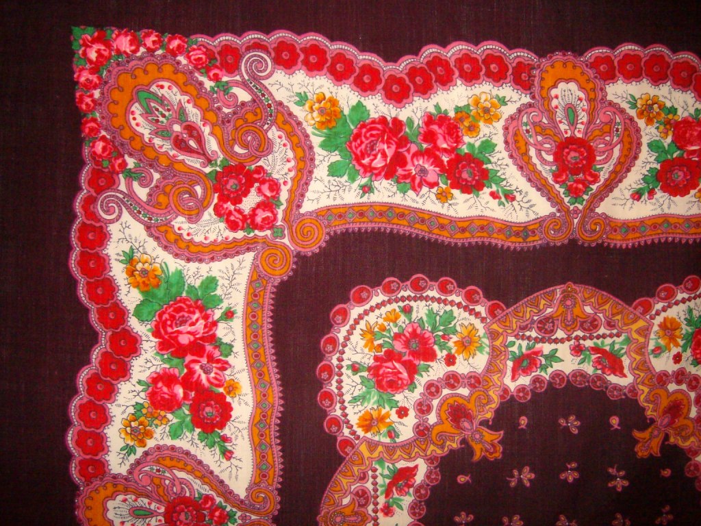 Ещё хотела сказать о качестве самого изделия: платочку более 25 лет, после стирок не полинял, краски сохранились, бахрома не превратилась в паклю, подшивка платка ровная.