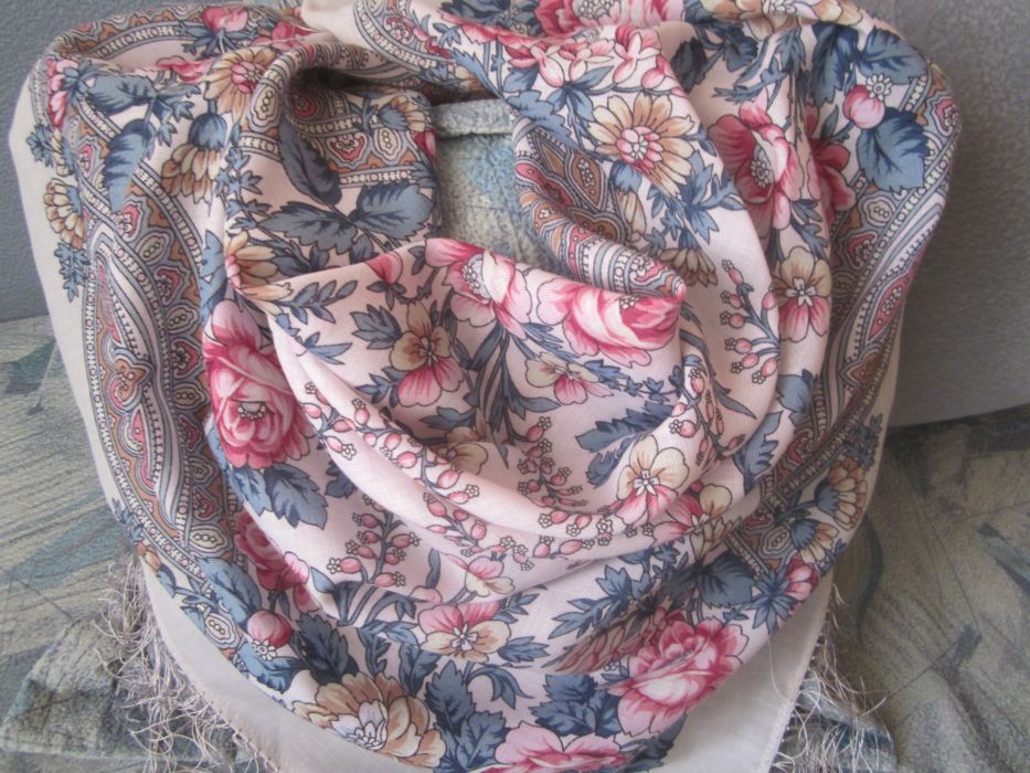 Платок активно ношен, стиран не раз, но краски яркие, причем изнанка почти не отличима от лица, такая же яркая. Сейчас размер 85х88-89.