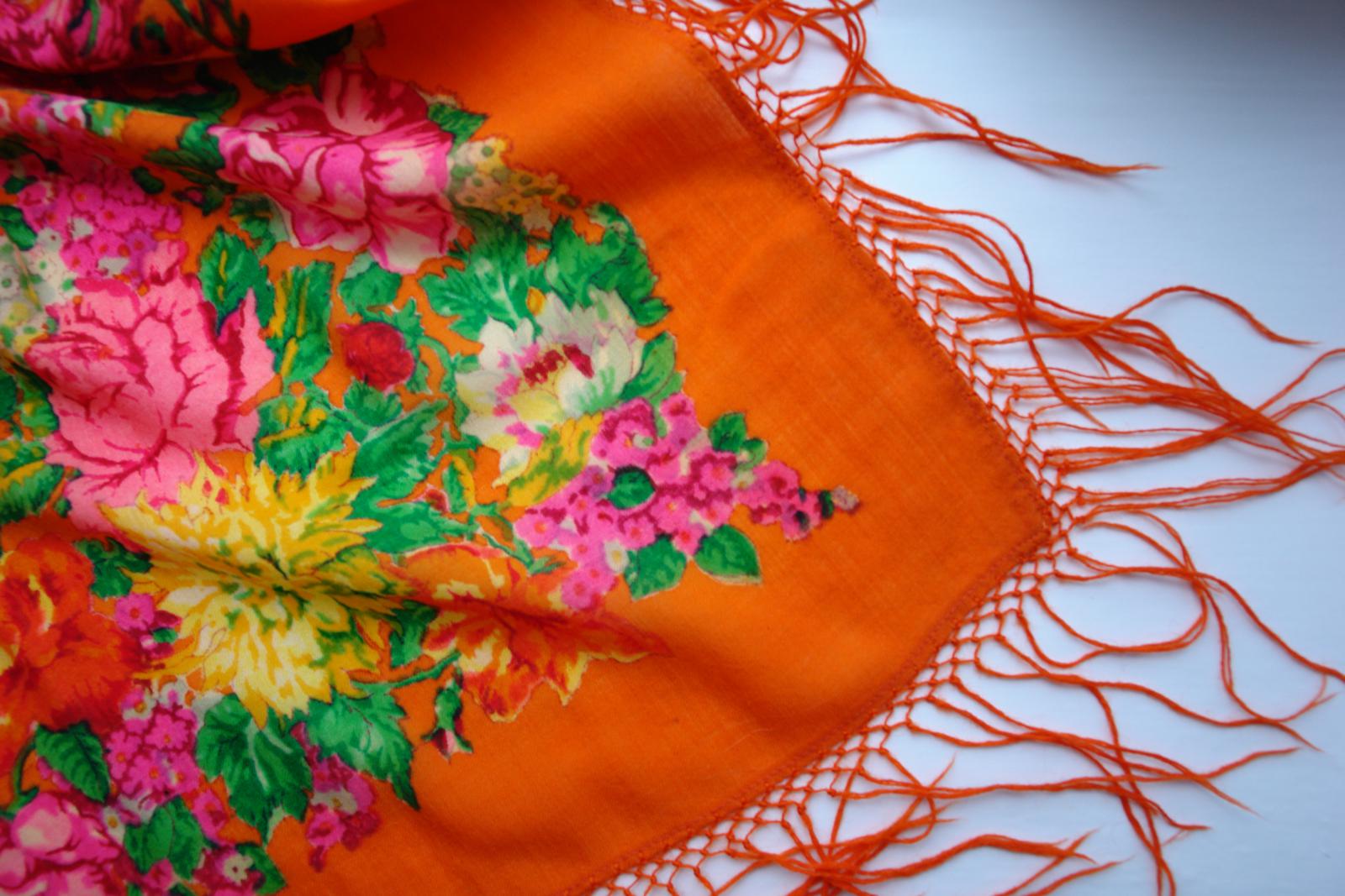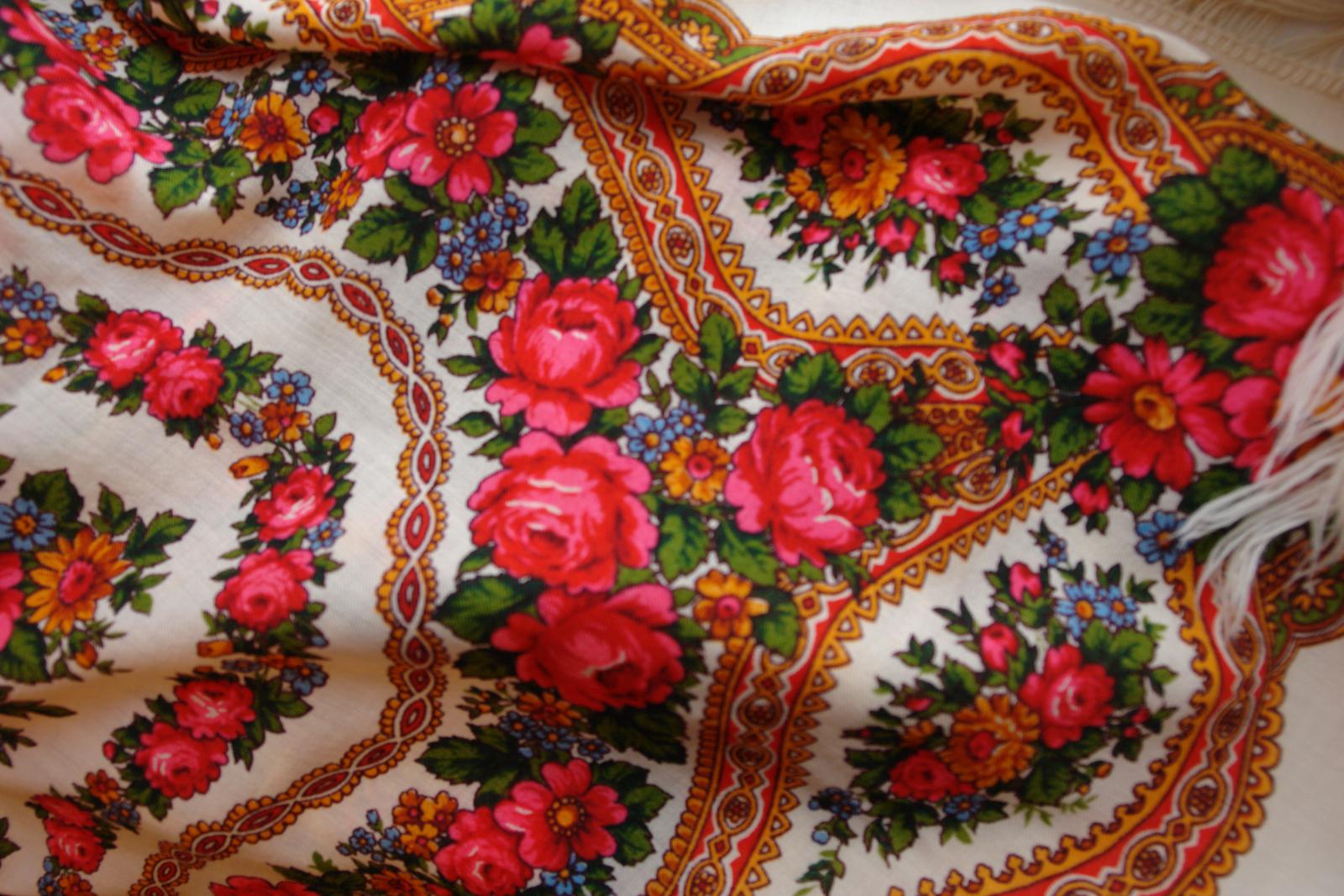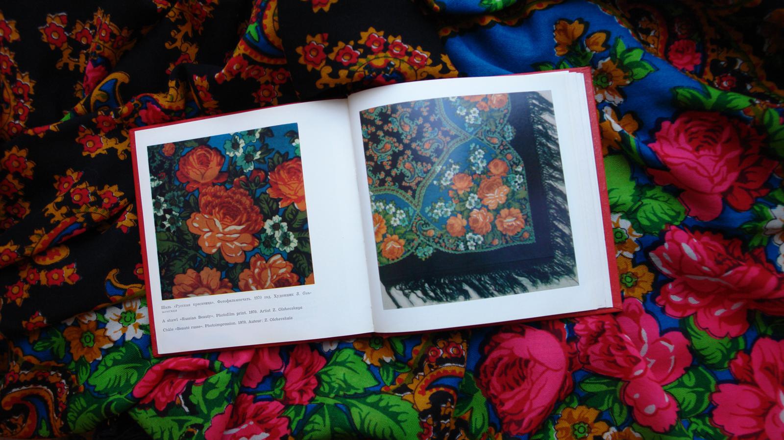 Так как БЕЛЫЕ РОЗЫ ручной набойки в настоящий момент ещё не найдены, то проиллюстрировать страничку из Н.Г. Рудина захотелось с помощью другой оранжевой шали ручной набойки авторства Лидии Шаховской