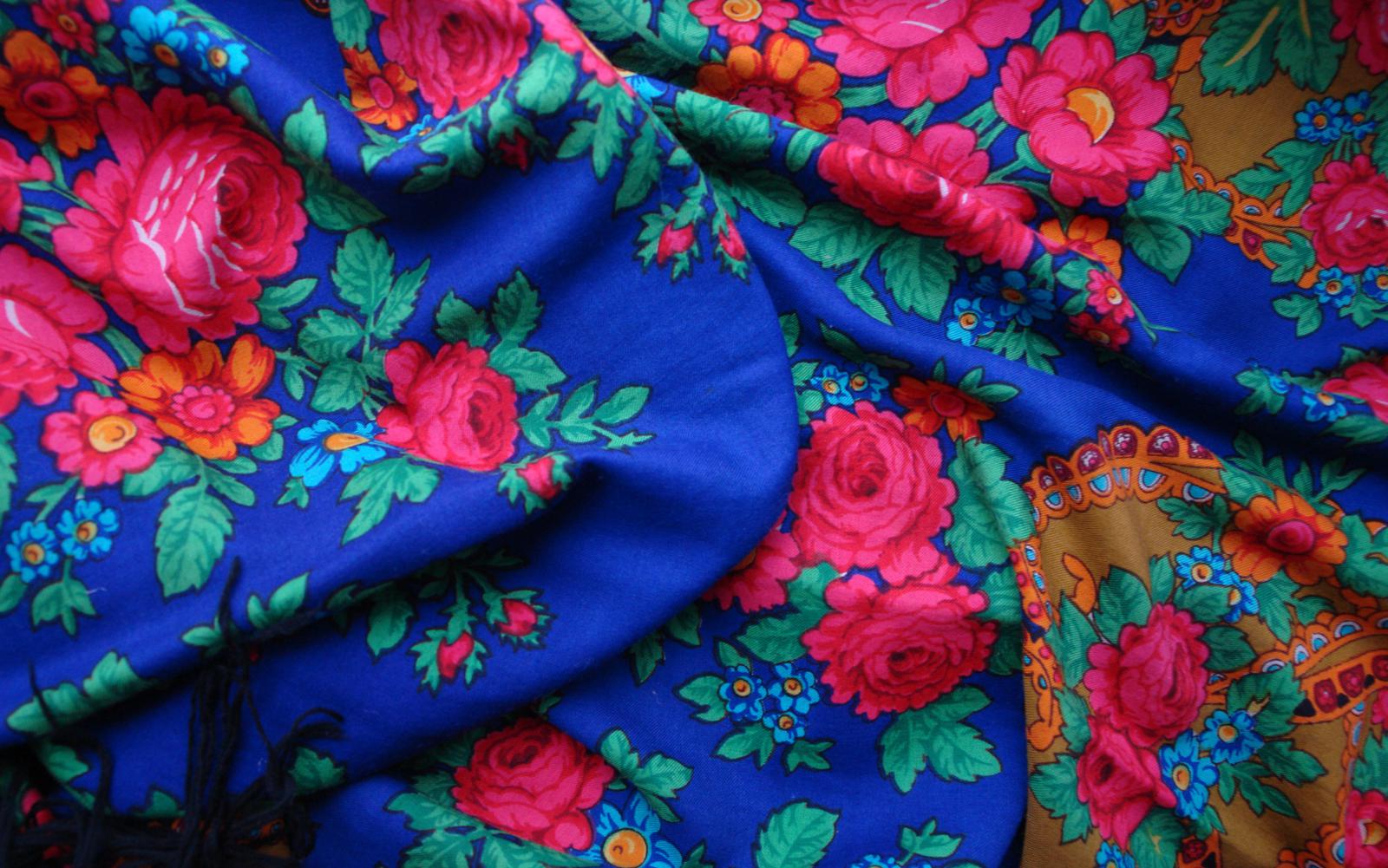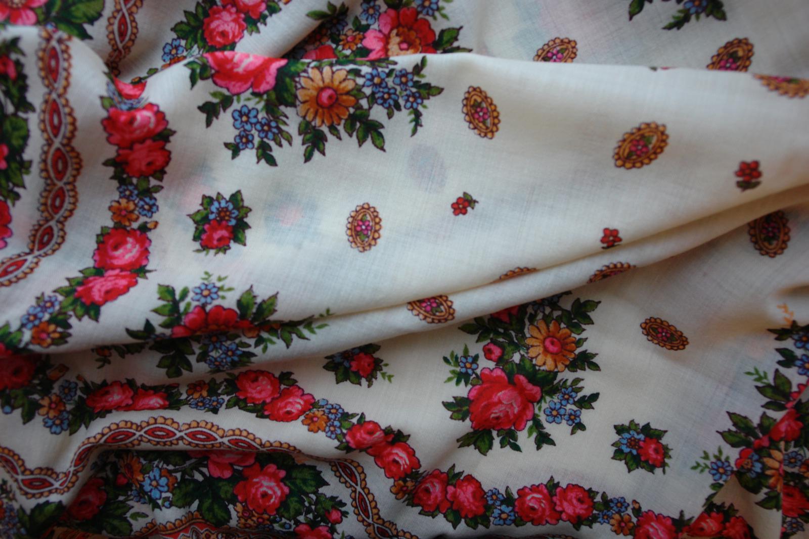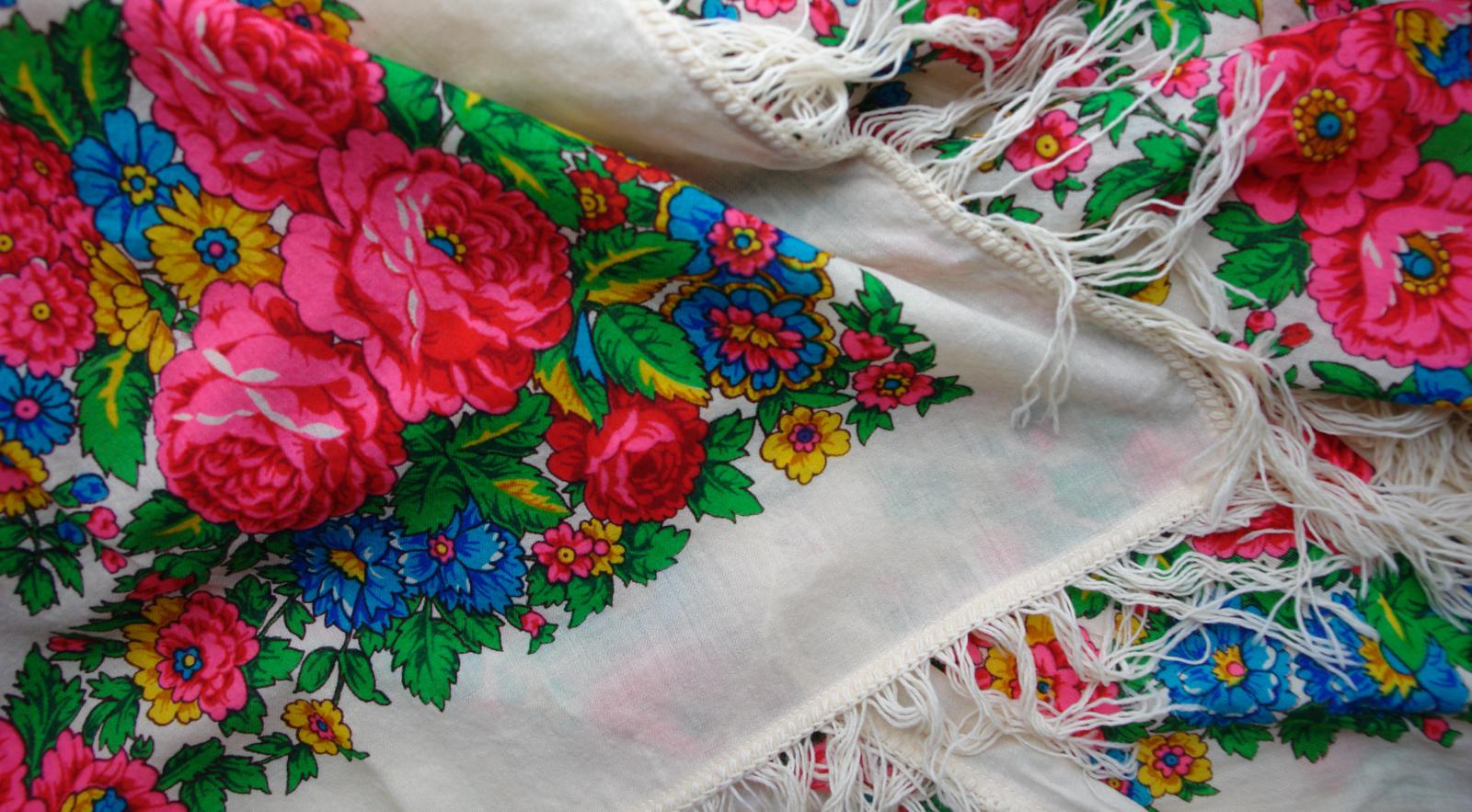 Так как БЕЛЫЕ РОЗЫ ручной набойки в настоящий момент ещё не найдены, то проиллюстрировать страничку из Н.Г. Рудина захотелось с помощью другой оранжевой шали ручной набойки авторства Лидии Шаховской
