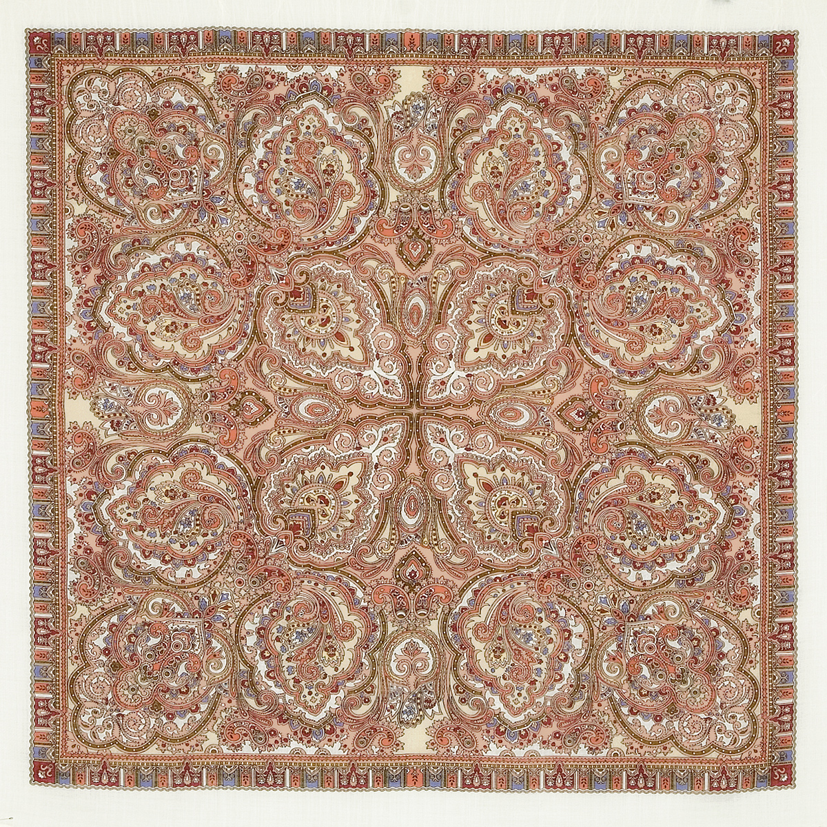 "Нашла прототип этой шалечки - в книге "Russian kerchiefs and shawls", изд. "Аврора", 1985 г. Это шаль 1820-40 годов, выполненная в технике ручного ткачества (предположительно, колокольцовская шаль), размер 158,5х154,5.