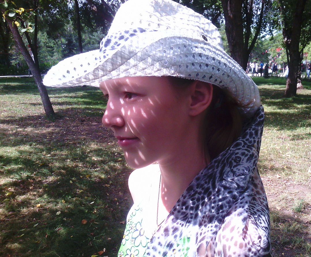 Я, т.к. ехала через весь город (соответственно - везде пробки, не смотря на выходной) на несколько мин. припоздала и немного растерялась в парке "Салют Победе". Была там "осознано и целенаправленно" впервые, так все мимо проезжала, и от обилия народа голова пошла кругом, думаю, где же искать "наших", пошла в другую сторону, но потом уже сориентировалась. И "наши" - Ирина и Юля с семьей - сразу нашлись, да еще опознавательные знаки приметные - платки! День был жаркий, за 30 градусов, я приехала в платочке крепдешиновом Сиртаки 18, доча Настя - на шляпу привязала шарфик креп-жоржетовый Кошачий глаз 2.