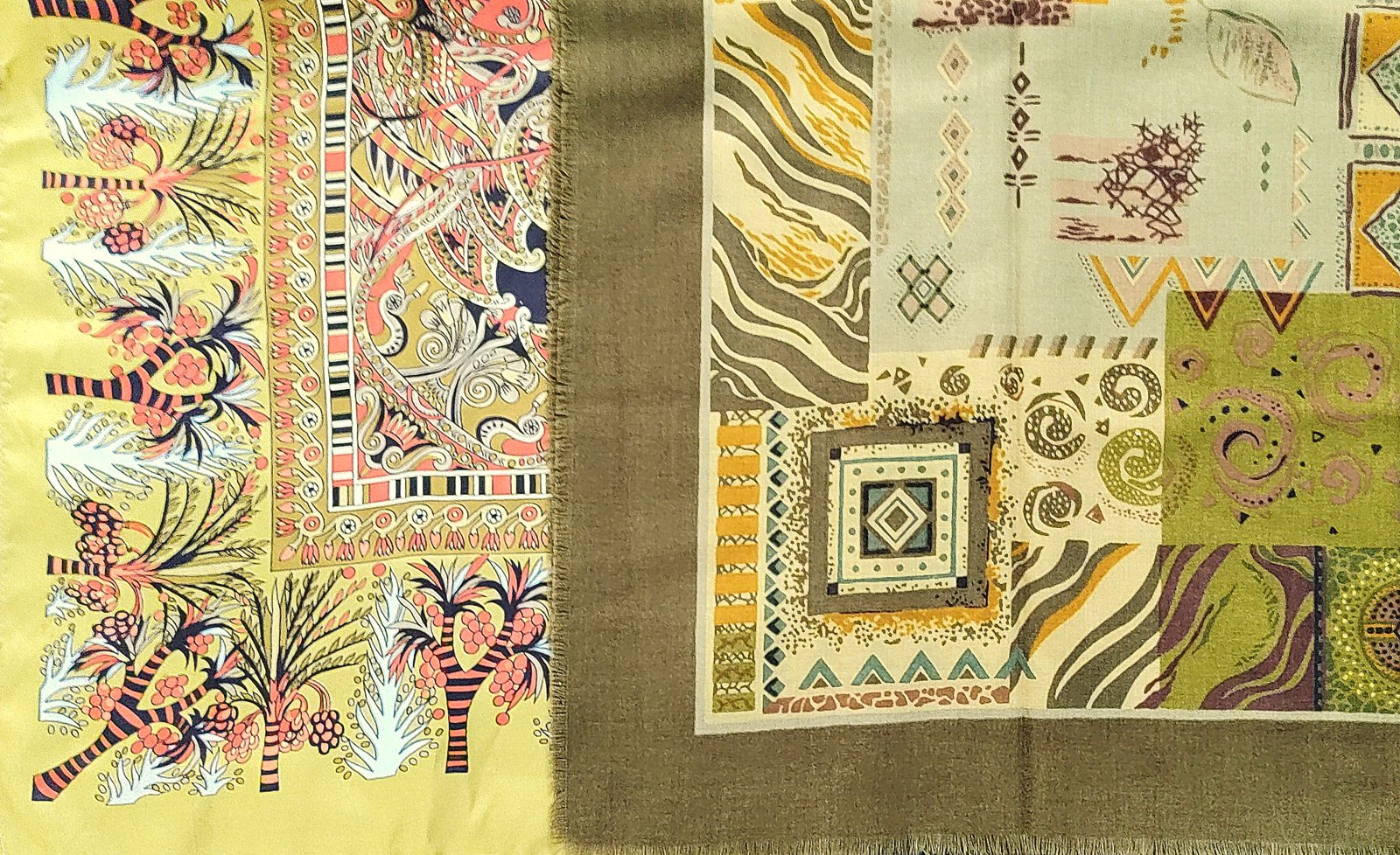 "Иллюзия" художник Фатеева Лидия, рис.877-10, шерсть 89х89 осыпка и "Золото Исиды" художник Белокур Наталья, рис.547-?, шелк (саржа) 89х89, выпуск 1998 год (платок - легенда ППМ и мой "бывалый путешественник"
