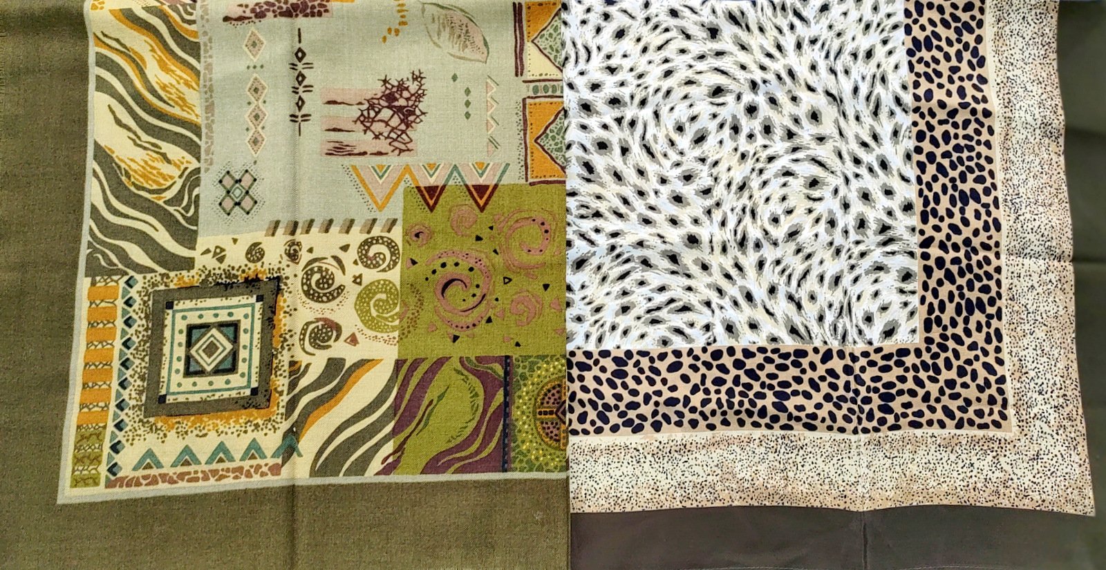 "Иллюзия" художник Фатеева Лидия, рис.877-10, шерсть 89х89 осыпка и "Ягуар" художник Зубрицкий Виктор, рис.847-10, шелк (крепдешин) 89х89.