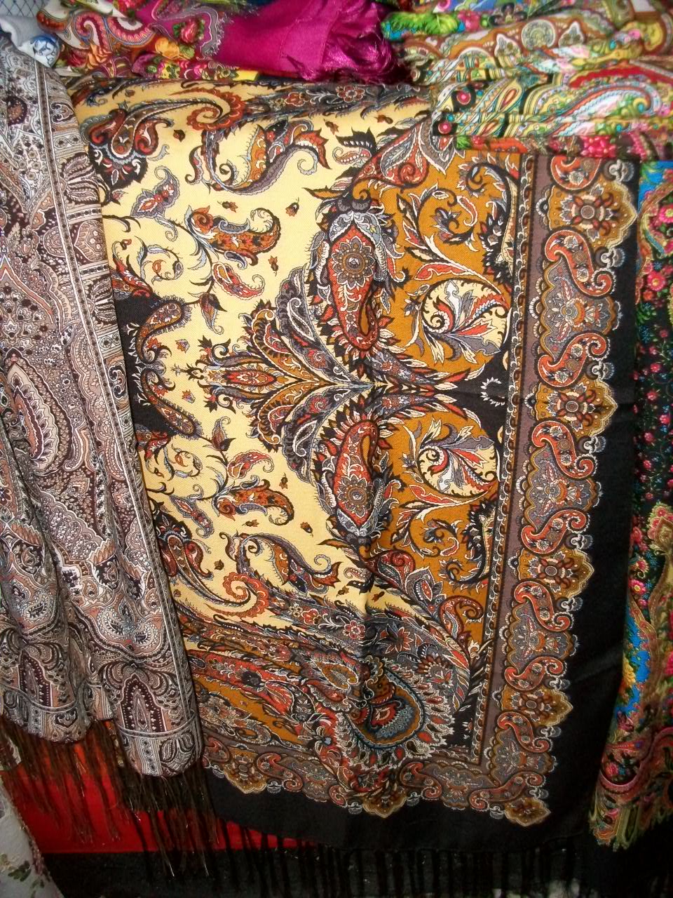 Продают и на улице, и в магазинах и уверяют искренно(возможно,сами продавцы не разбираются), что это именно павлововопосадские платки...Цена 550 и 320 рублей.
