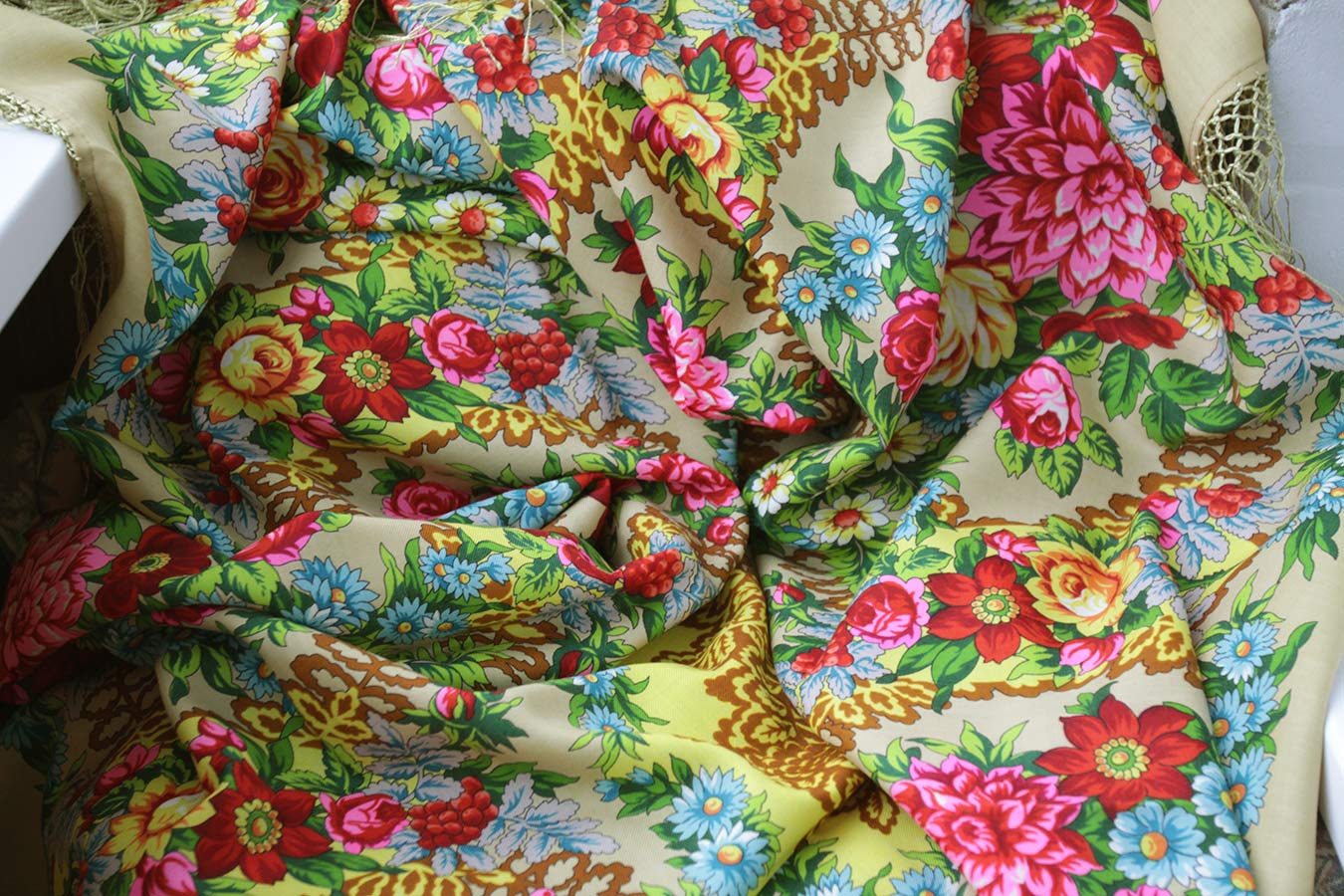 Жалко, если платки с просновками уйдут и их больше не будут выпускать. Есть особая красота в этой незаполненности поля рисунком, особенно в свете современных тенденций фабрики заполнить все поле мелкой вязью, в игре просновок. А какая была ткань, мягкая, шелковистая.