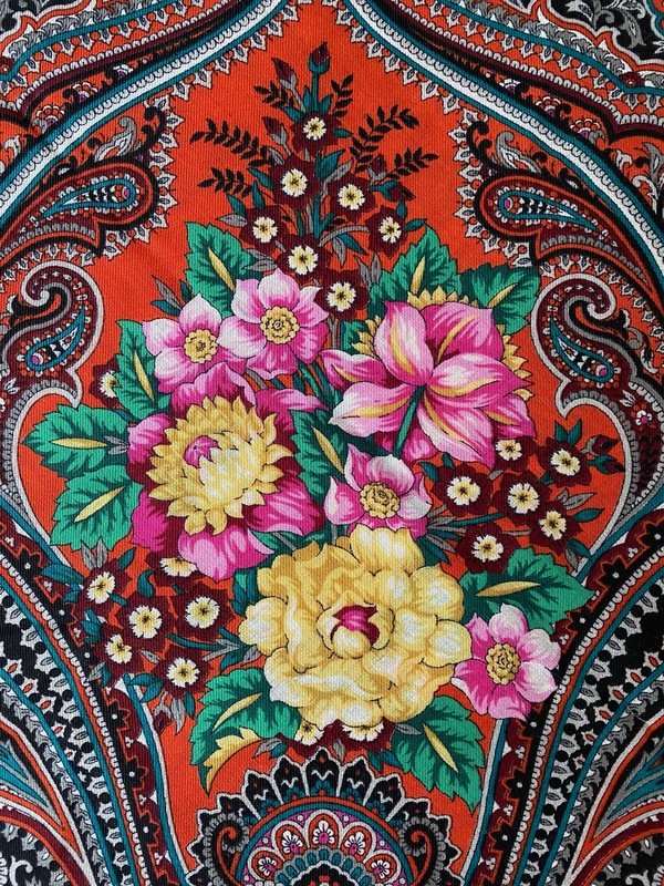 Все цвета в нем мягкие, несмотря на свою яркость по определению. Черный "с пылью" или очень черный антрацитовый, с примесью едва уловимого серого--угольный (Кликните, чтобы почитать оффтопик)...Однако, есть два цвета, которые не поддаются правильной цветопередаче: это основной светло-томатный ( или темно-морковный)--тот самый цвет костра ( на камеру выходит ярко желто-красным или почти оранжевым) и зеленый цвет в орнаменте и листиках мелких цветков , предположительно- спараксиса. Если "рыжий" еще немного уловим , то зеленый здесь в реальности-- темная, чистая "бриллиантовая зелень"--зеленка. На фото упрямо получается простая бирюза, поэтому не удалось передать эффект сочетания этих цветов.