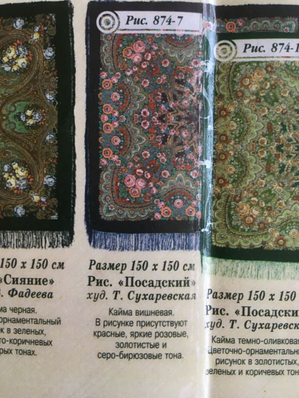 Хотя он был в каталогах когда-то, раз есть такая вот картинка (картинку скопировала себе откуда-то с нашего форума, не могу теперь сообразить - откуда именно, чтоб дать ссылкой, поэтому рискну разместить фото в этой теме - прошу прощения! - если нарушаю, то прошу модераторов удалить фото) И если цвета Посадского-7 в реале мы можем только предполагать, то фотографии реальных двух других шалей у нас на форуме в архиве есть - можно посмотреть и примерно составить представление о перевыпускаемом...