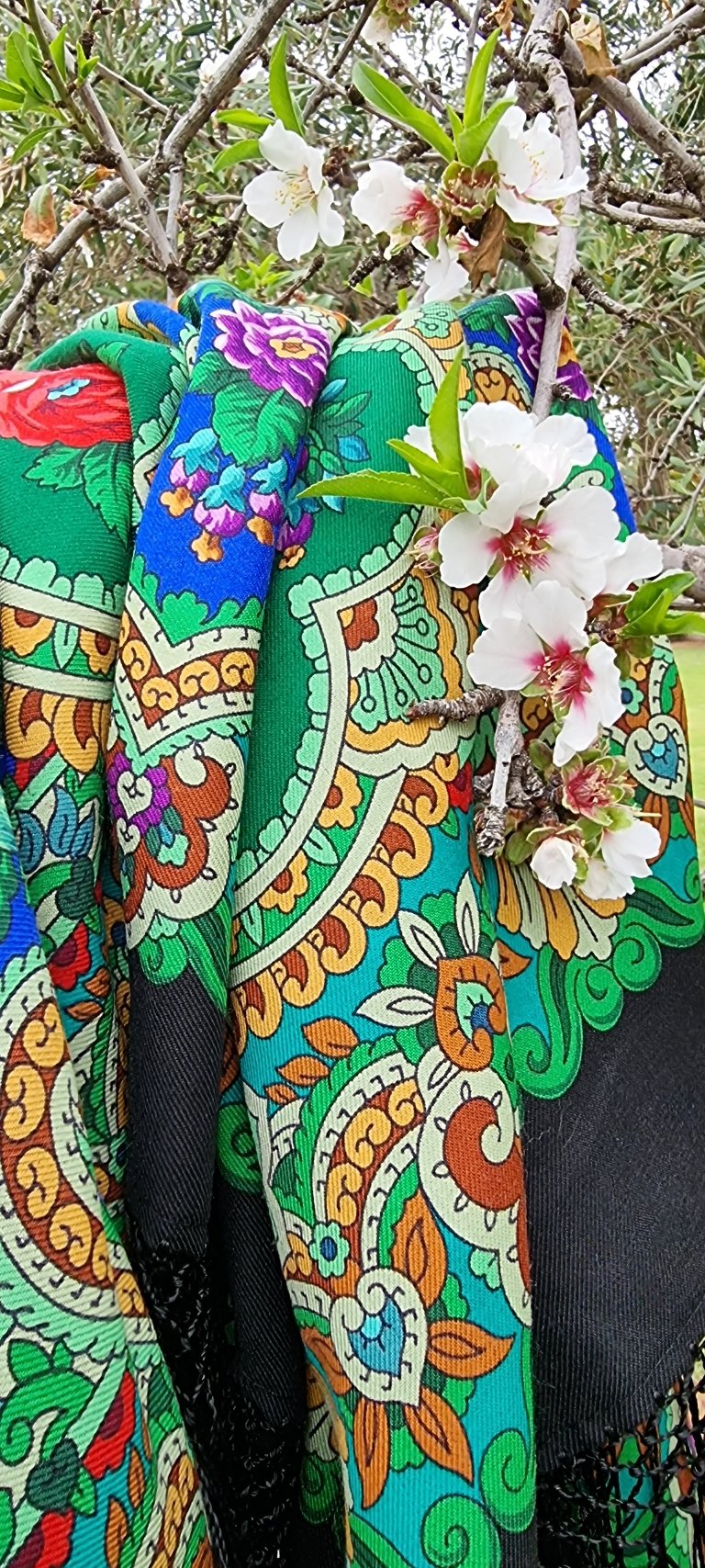 Словесный портрет : светлый, радостный платок, нежный колорит. Ничего фломастерного и неонового. Ассоциации--какие душе угодно... вспомнились манго и драконий фрукт. Понравилось сочетание "темной рамки" каймы с такой светлой серединой--нет эффекта зефирности.
