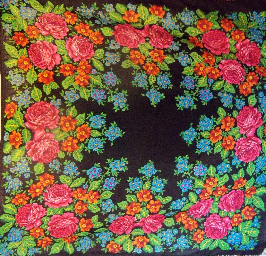 Платок шерстяной 90х90 с круговым цветочным мотивом с пышными розами и ромашками