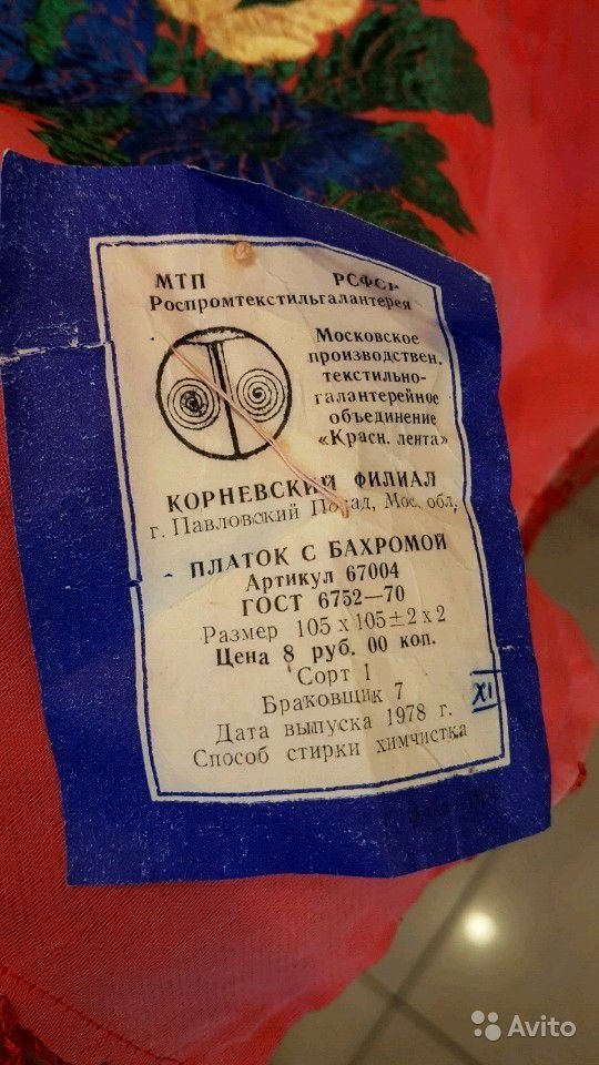 Для полноты картины подброшу ещё фото платка "Красной ленты", его этикетки и аналогичного музейного экземпляра: