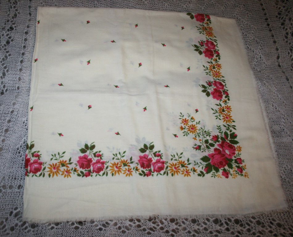 Этой осенью повела гулять своих борзых, захватила мусор (выбросить), подошла к помойке и вижу - лежит на боковинке платочек - мокрый (дождь был), грязный уже (серый такой).... в общем, я, покрутив глазами вокруг, цапнула этот платочек, дома сразу стирать, сушить, гладить... оказался нежнейшего бархатного хлопка очень приятного цвета такой вот платочек! Думается мне, что очень давно выпущенный, может, Павлово-Посадский Положила к своим, а перед этим - и на голову, и на плечи, и на шею - приятен на ощупь - слов не найти какой! И почему так редко выкидывают такое (хотя, лежал явно с надеждой, что кто-то возьмёт, вот я и взяла
