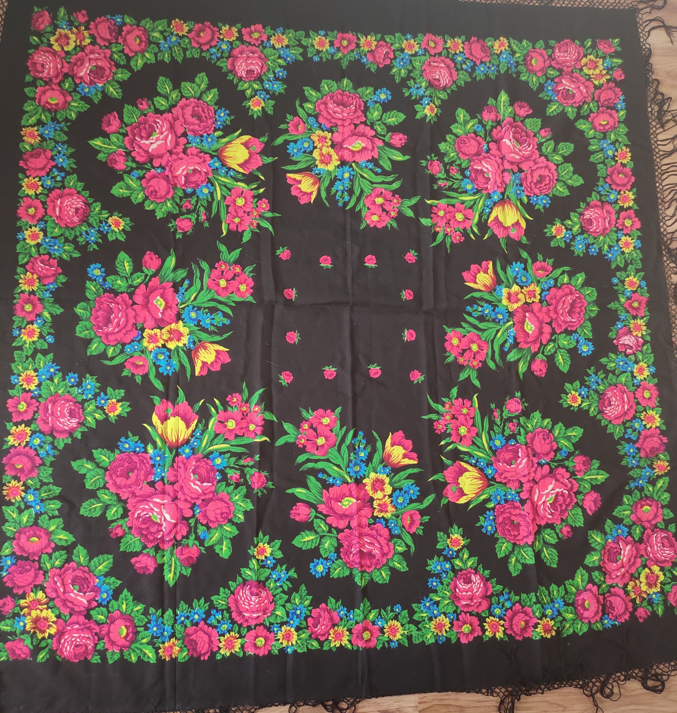Хлопковый платок, если точно, то 91 на 92 см, с бахромой, колорит не совпадает ни с одним из представленных на данный момент на форуме шерстяных вариантов. Поле красное, цветы красные и жёлто-оранжевые. Синие и т.п. краски отсутствуют.