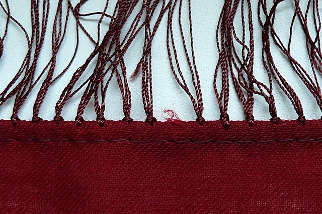 Бахрома ужасна, местами она даже не закреплена в ткани, а просто вдета, из-за чего уже при первом осмотре платка часть её просто высыпалась, местами прямо какие-то "колтуны" из бахромы, а на отдельных участках её вообще нет, но зато на этих местах ДЫРЫ!