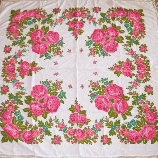 А вот что еще нашла у Баровского. Он пишет, что в начале 1960-х годов фабрика [полагаю, он имеет в виду ф-ку 10-летия Красной Армии] выпускала 25 видов платков: чистошерстяных, полушерстяных, хлопчатобумажных ручной и машинной набивки [далее - не очень для нас интересно]. О шелке и полушелке - ни слова! Это я к тому, где мог быть напечатан Любин платочек.