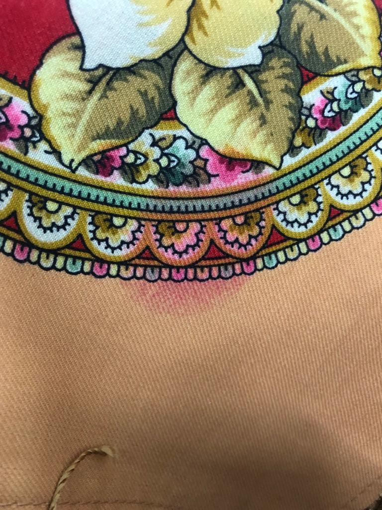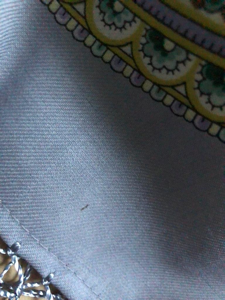 На фото то, что я получила. Полный набор: затяжка, дырка на кайме в углу, кривые углы и, самое неприятное то, что в середине какие-то серовато-желтоватые пятна (на фото, возможно, не очень видно), то ли от солнца, то ли от, простите, от ручек.
