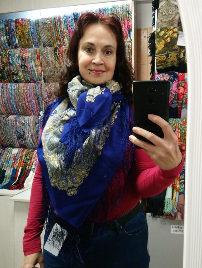 Яркий и глубокий ночной синий, ему тут есть где разгуляться, фона много, смотрится очень красиво. К сожалению, свет в магазине слабый, показать платок во всей красе не получилось.
