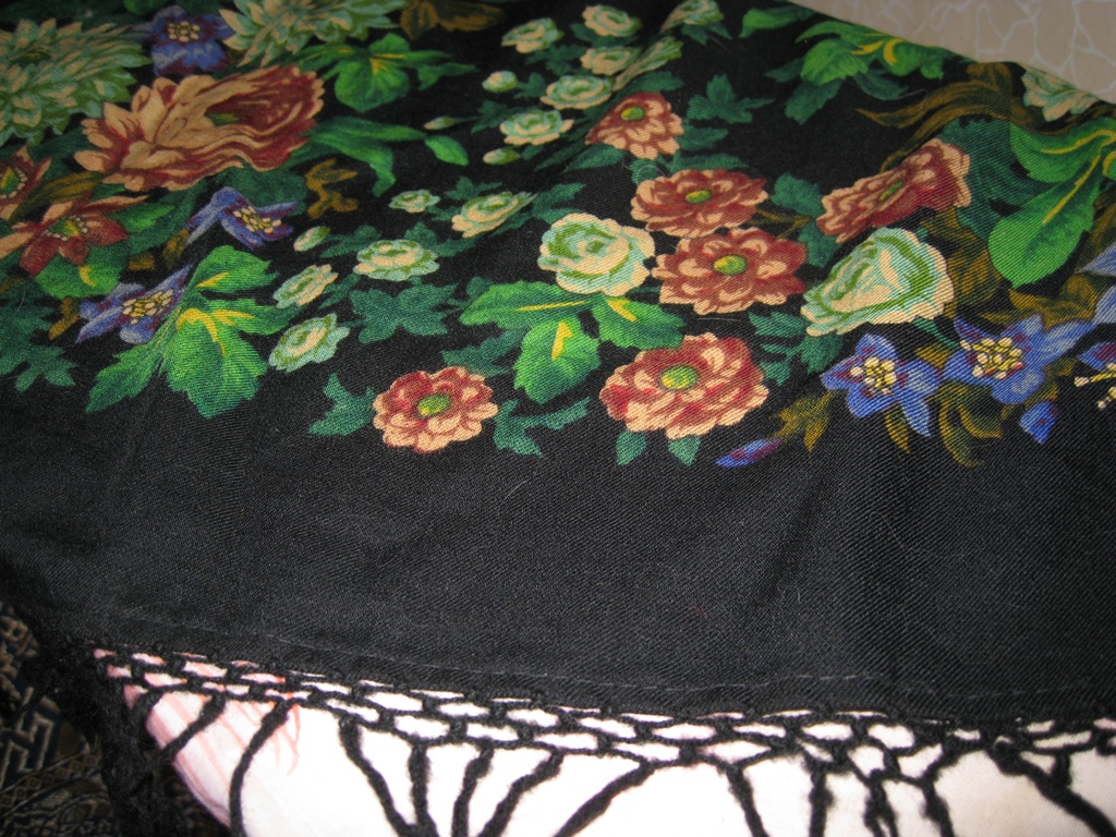 Здравствуйте! Есть у меня шаль, еще мама в молодости носила. Не из павловопосадских ли она? Ткань довольно плотная, шерсть, размер полотна примерно 145х145, по низу украшена шерстяной бахромой с плетением. Платочек старенький, пережил не одну стирку, и почему-то мне кажется , что розы изначально были ярче, зелень сочная, но точно не знаю, не видела каким он был "до". На фото розы кажутся красноватыми, на самом деле они бордово-коричневые и лепестки георгин в серединке слегка розовые и это мне кажется старит платочек. Хотя сам узор очень мне нравится ! Пока не решилась выйти в нем в люди, хотя примеряла :Q