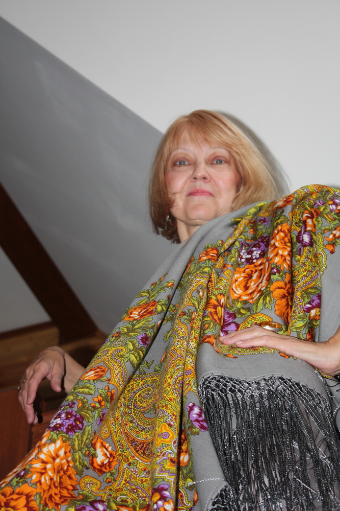 Приятно посмотреть. Ваша коллега-красавица, приятное одухотворенное лицо, и шаль ей очень идёт.