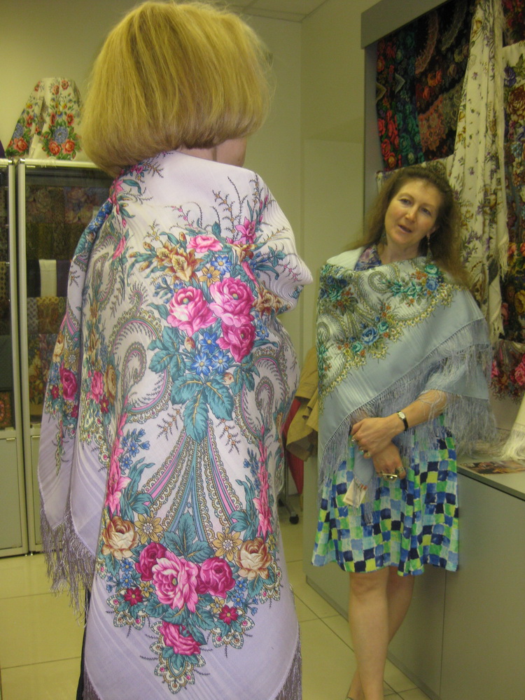 В Петергофе и Павловске видела платки, но это оказалась жуткая подделка под Павлов-Посад. Меня не проведёшь, а туристы смотрят, приглядываются. В общем, расцвела буйным цветом пародия на ПП. Хотя, колориты-то интересные у подделок.