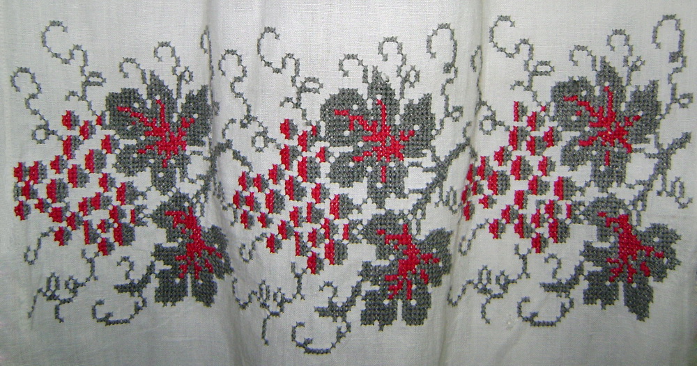 Не помню, я показывала фрагменты? На всякий случай покажу кусочек вышивки на рукаве. В качестве оригинала послужила найденная на чердаке дома в селе Опрышаны буковинская вышиванка. Рисунок я восстановила сама.