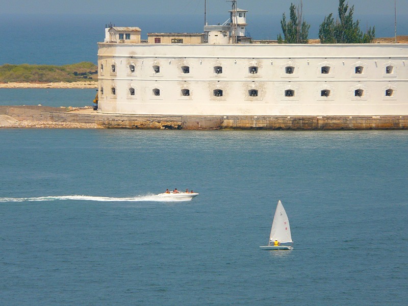 Этот монумент увековечивает память кораблей Черноморского флота, затопленных по решению командования для предотвращения прорыва в бухту вражеской эскадры.Здесь затопмлм 5 линейных кораблей и 2 фрегата.Их мачты остались торчать над водой. Случилось это в 1854г. Но это было только начало... Всего в бухте было затоплено 75боевых кораблей и 16 вспомогательных, включая шхуны.