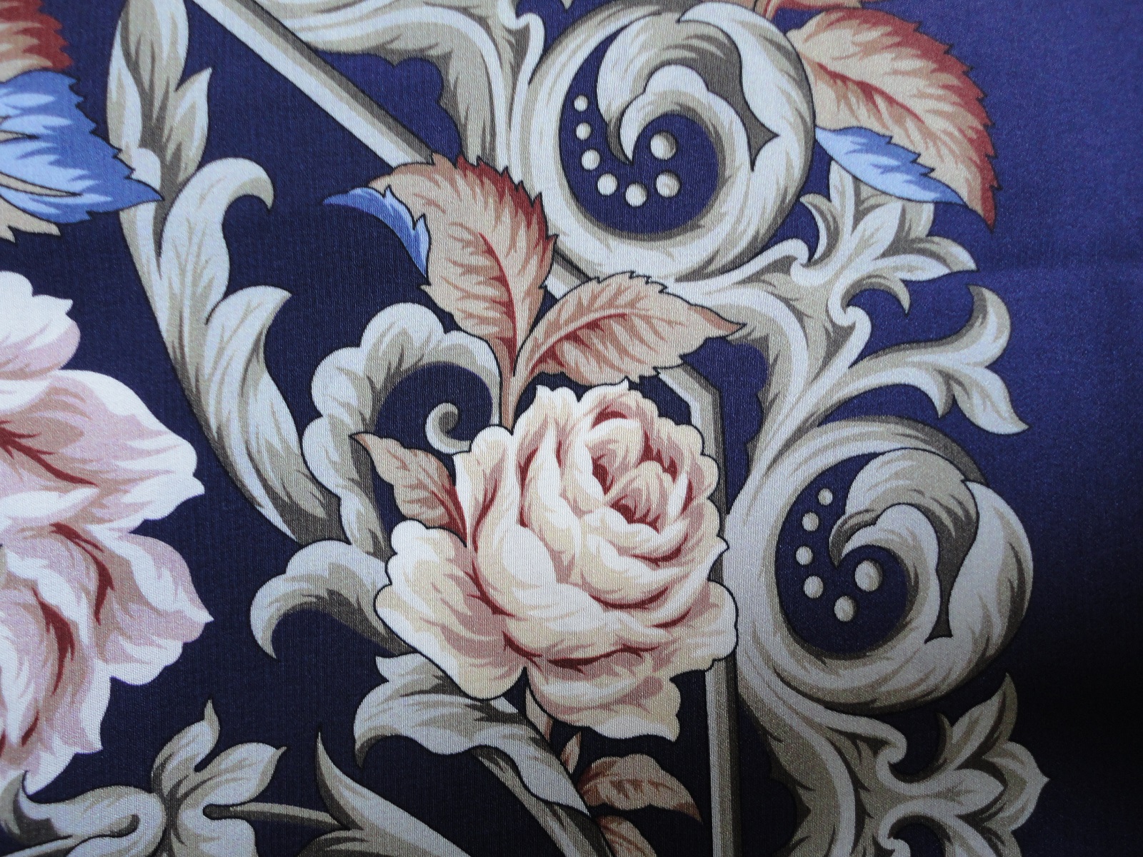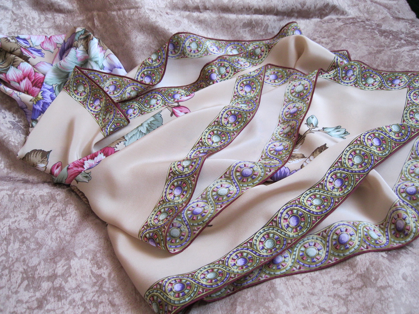 Очень по душе мне пришлось его персиково-зефирное настроение, белые розы, гроздочки золотых маленьких цветочков, спокойный светло-серый цвет каймы, красные кончики серых листочков и дивные "каменные цветы " в орнаменте :: Пару фоток на тушке в Примерочную отнесу)