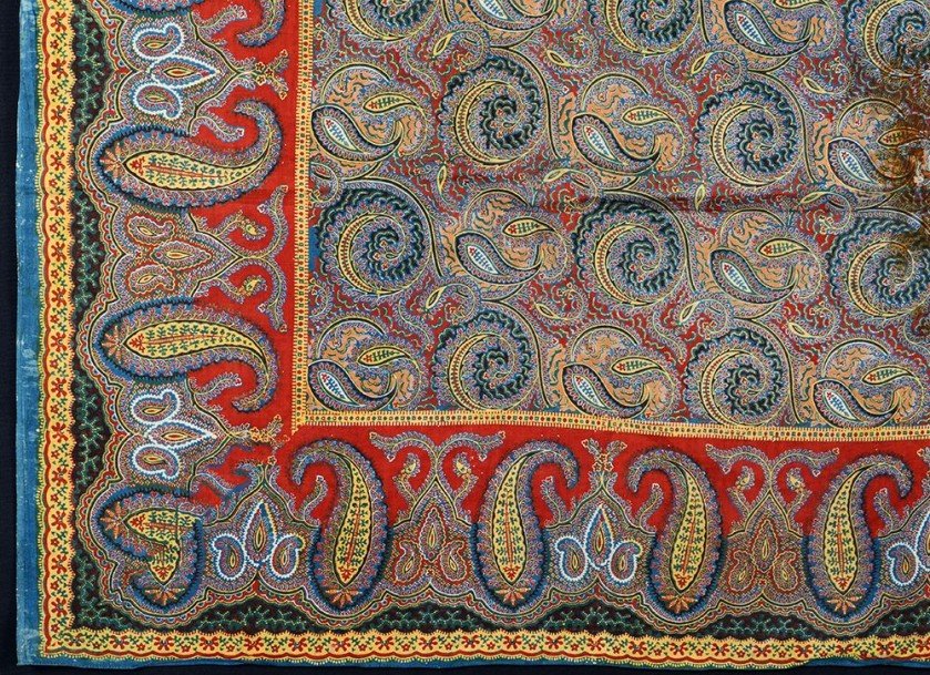 Набивная квадратная кашемировая шаль с ярким многоцветным рисунком, эпоха Луи-Филиппа