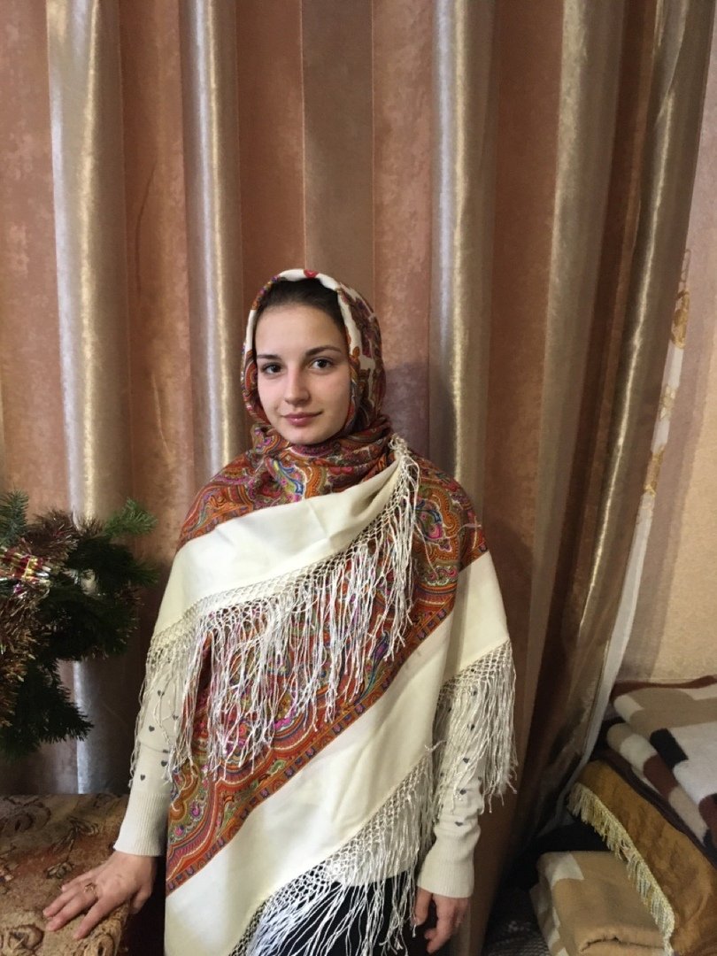 Девочки вспоминали Восточную птицу 0. Она как раз прилетела к нам под ёлочку. Какая чудесная экспериментальная ткань! Шелковистая и мягенькая. Узор уже неделю рассматриваем и всё новое находим. Красивый рисунок, слов нет. Мало их, белопольных орнаментальных шалей. Внучка Анна стала моделью для неё. ::