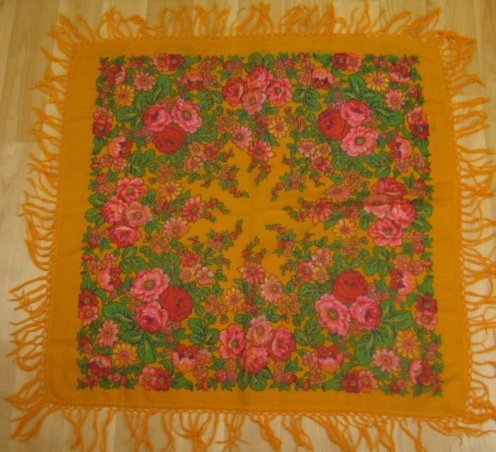 У меня похвастушки, купила платочек ппу_35 Ирины Дадоновой, очень мне нравится этот яркий рисунок... Судя по этикетке, почти 30 лет в сундуке у кого-то пролежал...