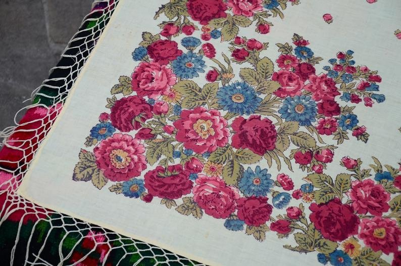 Кайма и середина платка черные, заполненные мелкими цветочками. Орнаментальный рисунок содержит бирюзовые тона.