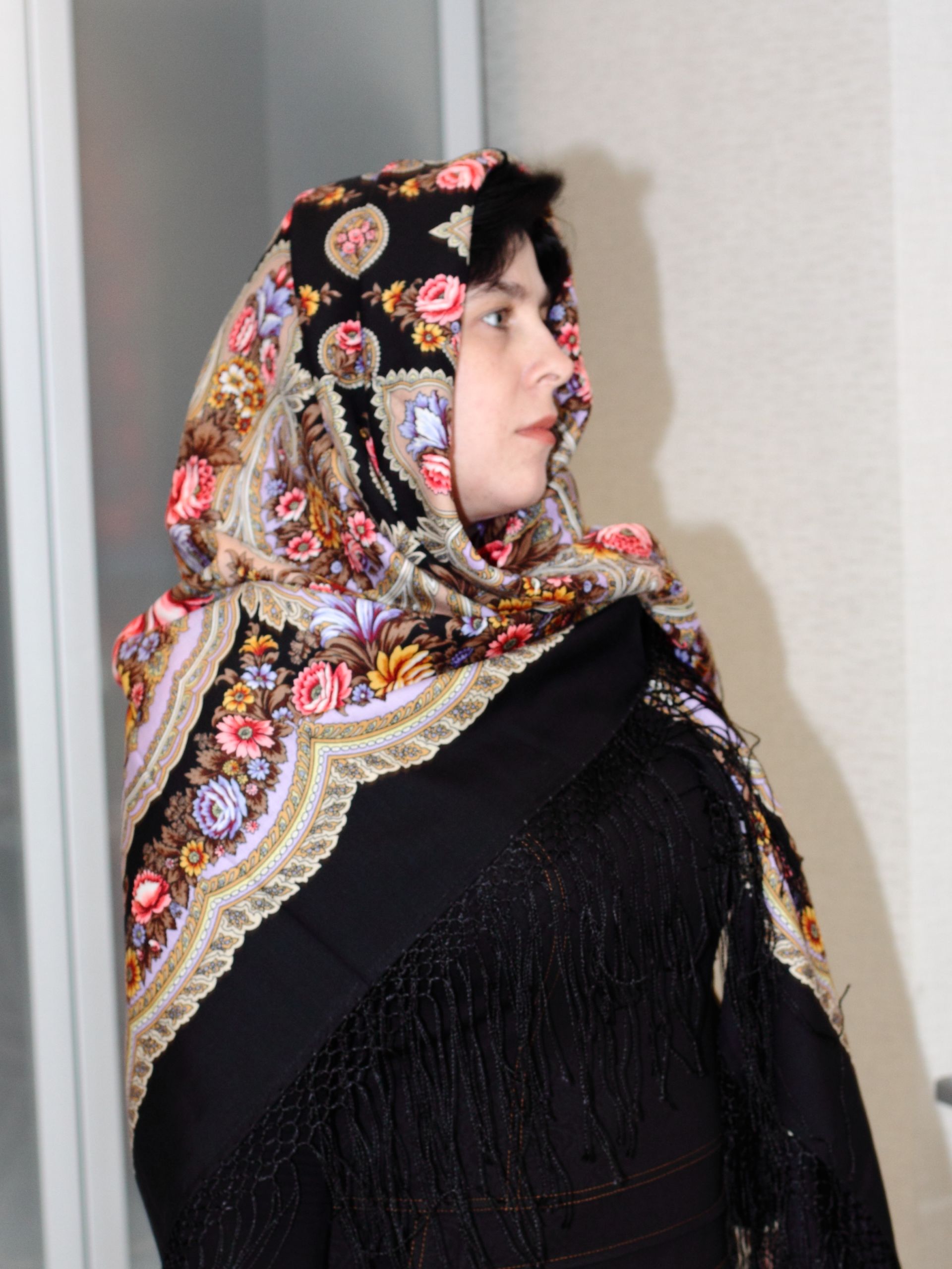 Вот ещё по совету уважаемой Провизор засмотрелась на шаль "В лунном свете" и получила сегодня. Дома развернула и задумалась: наверное, она слишком светлая... Но к лицу приложила - ничего так. Что скажите??? (только говорите, как есть, если "не фонтан", то я её подарю). Извините, что боком. Из всего, что муж нащёлкал, эти более-менее приличные.