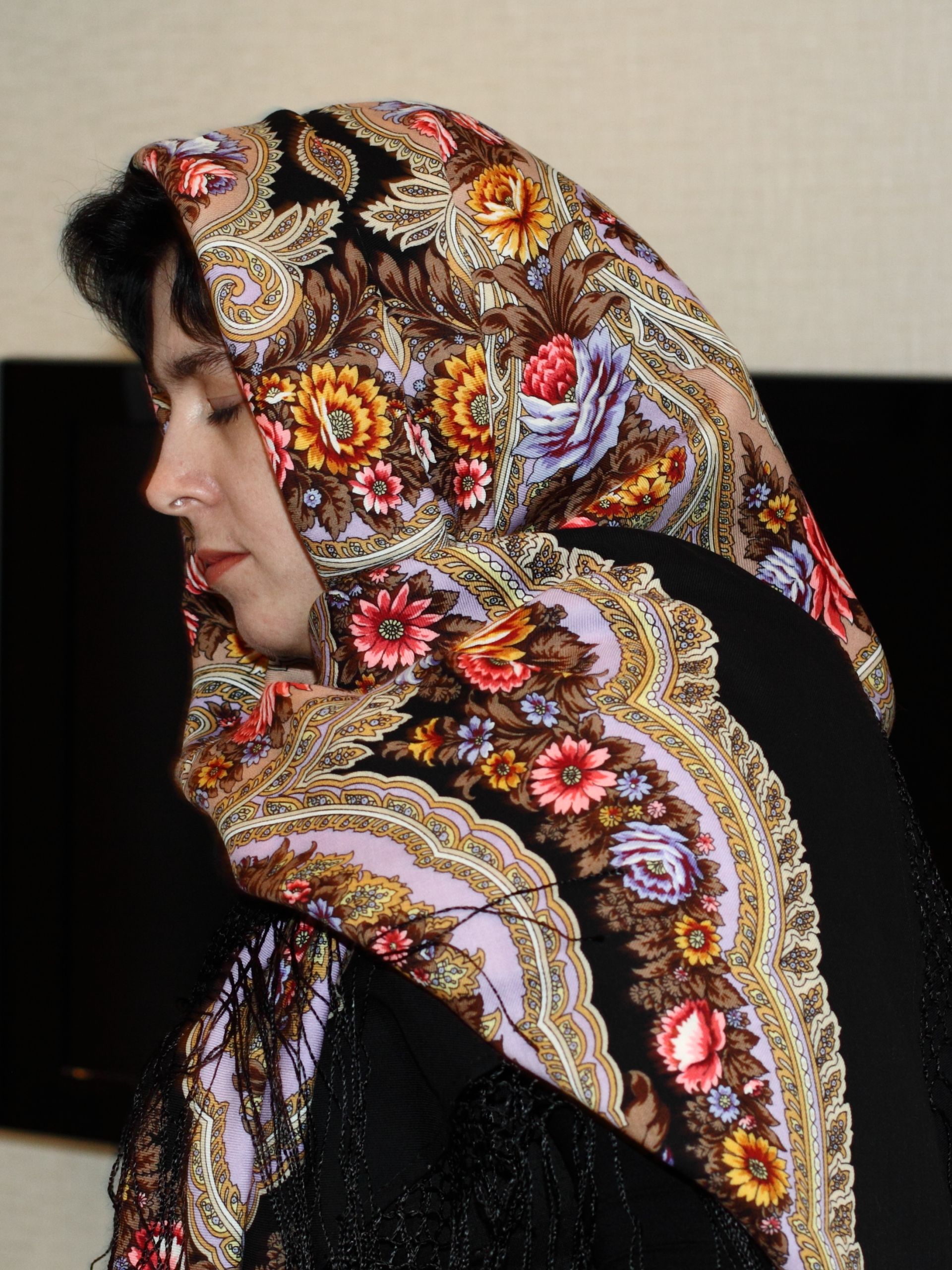 Вот думаю, что эту шаль годится мне только на голове носить или поплотнее шею заматывать. Как вам? Что-то очень хочется ее себе оставить. С сероватой кофточкой непонятного цвета будет симпатично...